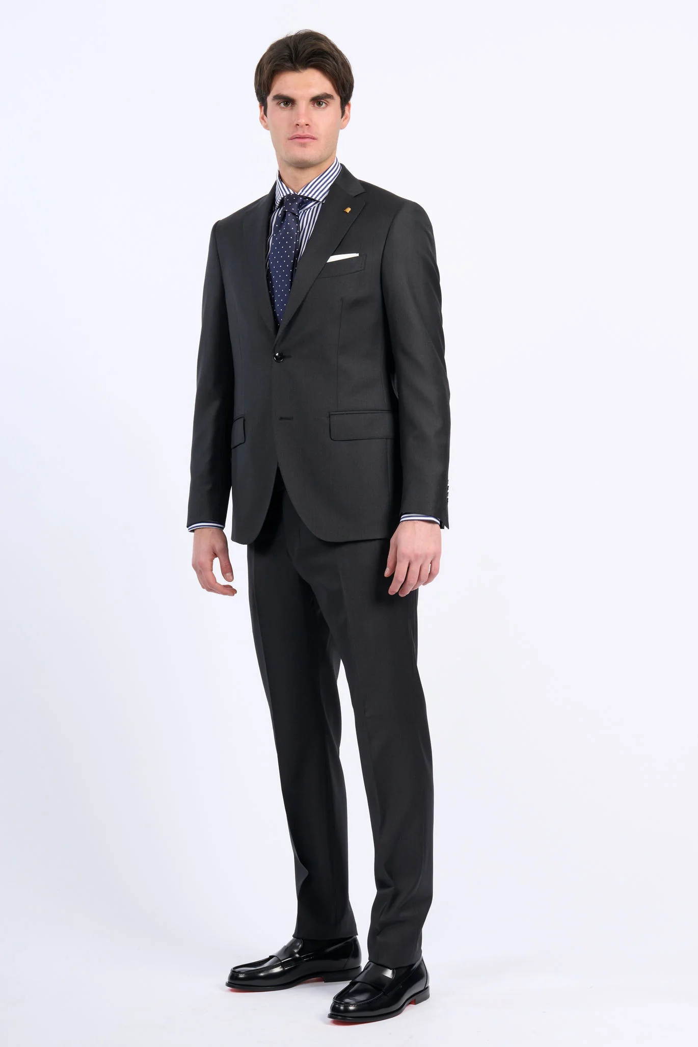 - Abito monopetto in fresco di lana grigio antracite.