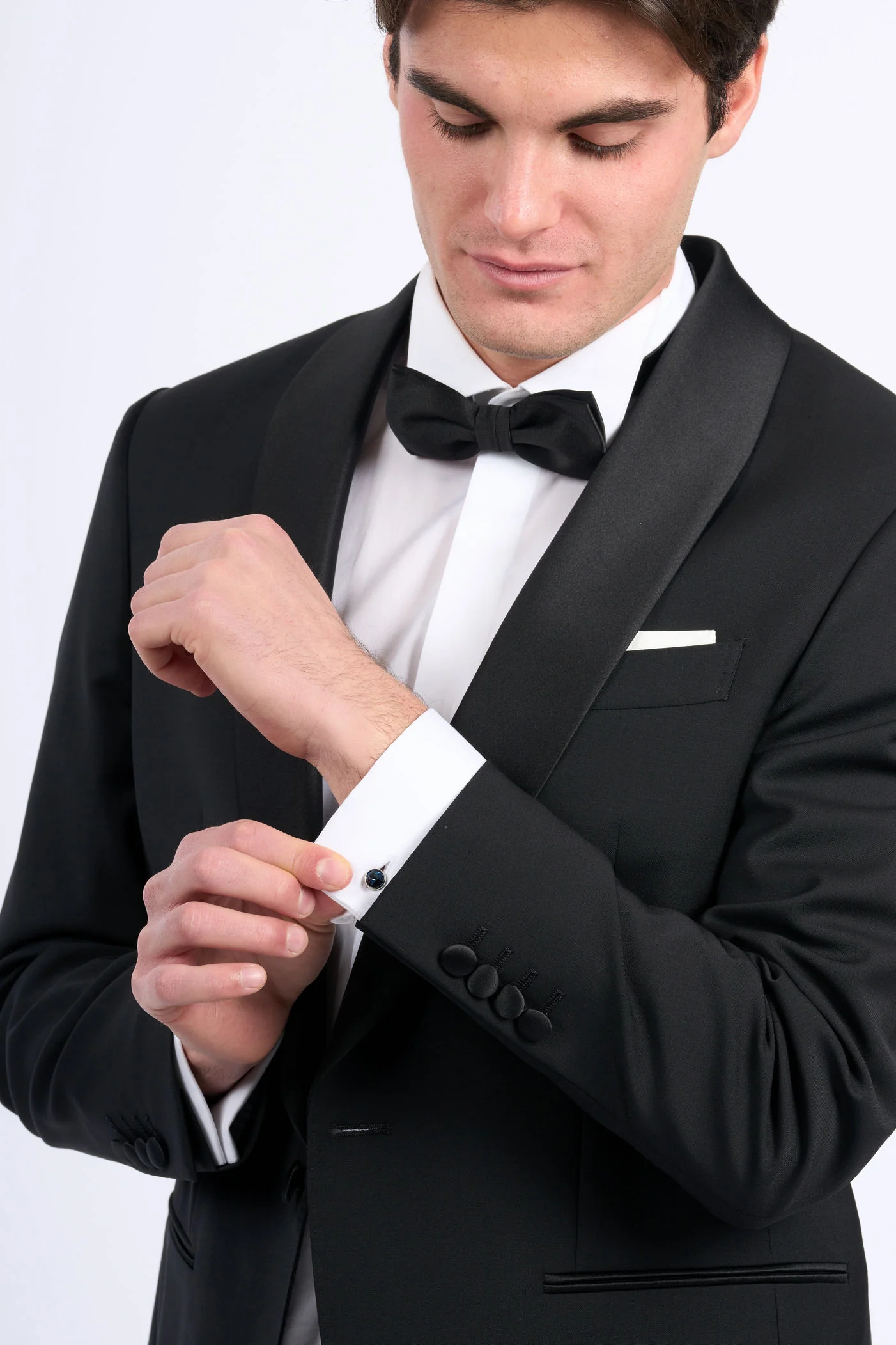 - Giacca con collo a scialle in raso nero.